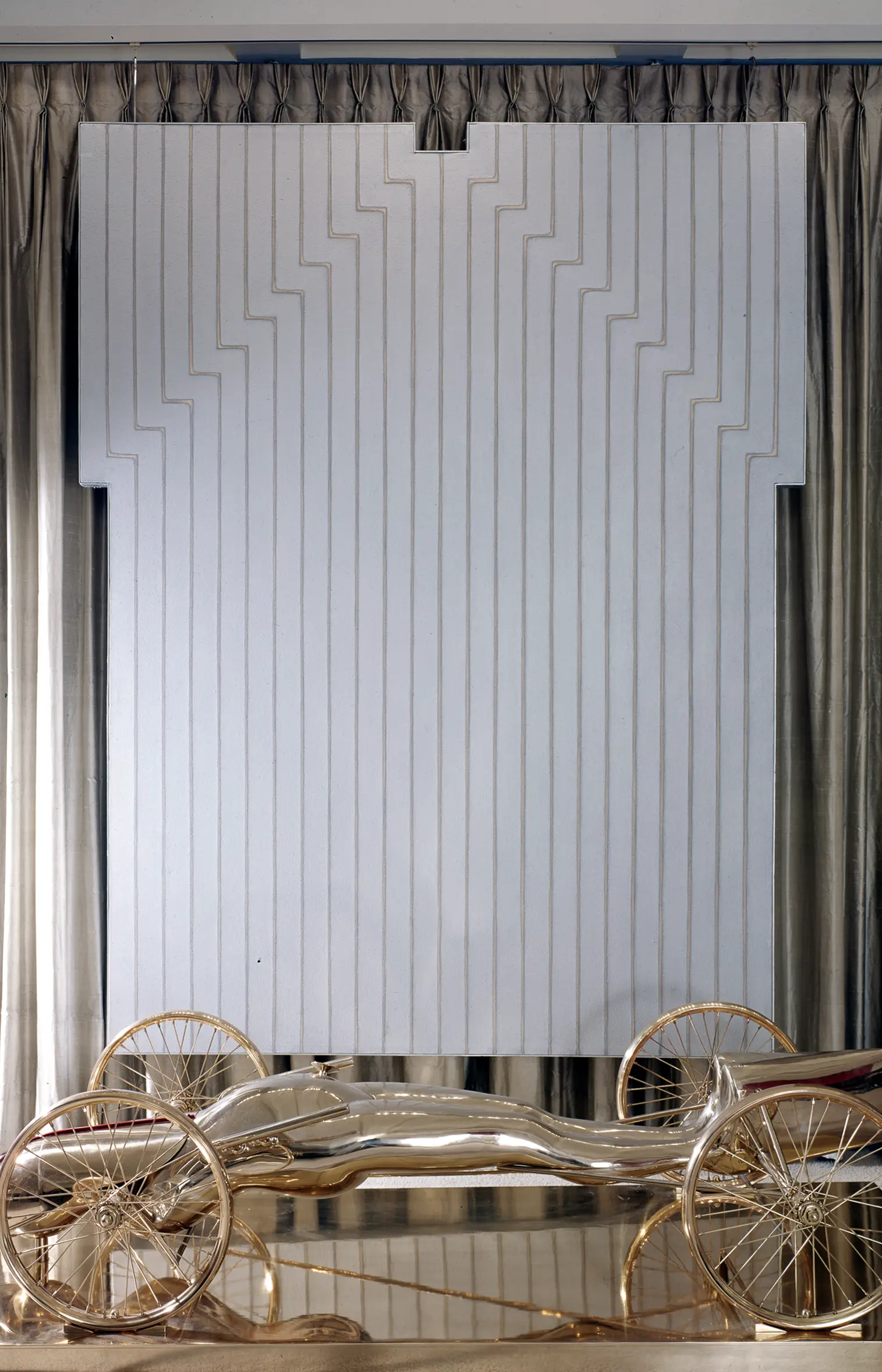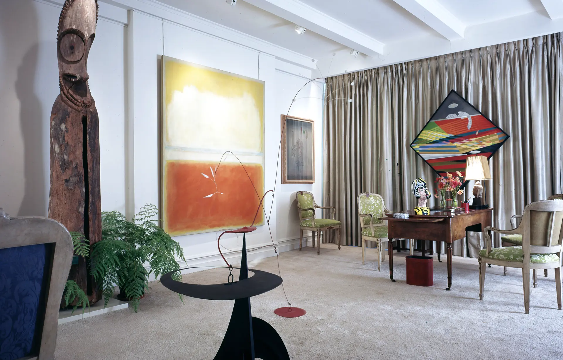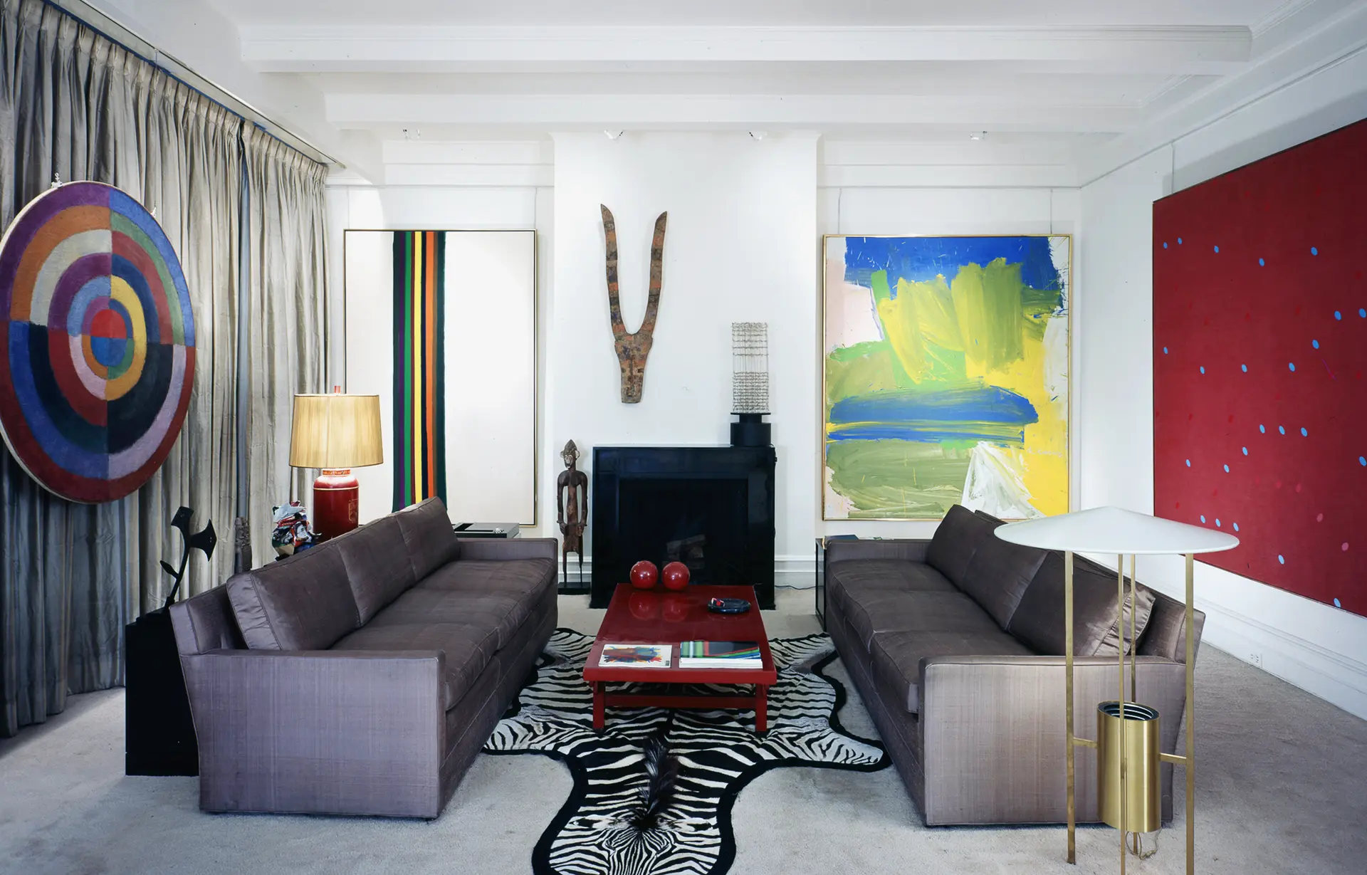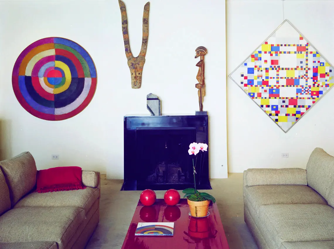 Image: Robert Delaunay’s “Premier Disque” (1912-13) and Piet Mondrian’s “Victory Boogie-Woogie” (1944) in the Tremaine’s apartment circa 1984, alongside a 20th century African wood mask from Burkina Faso, Brice Marden's “Marble #14” (1981), and a Senufo female form