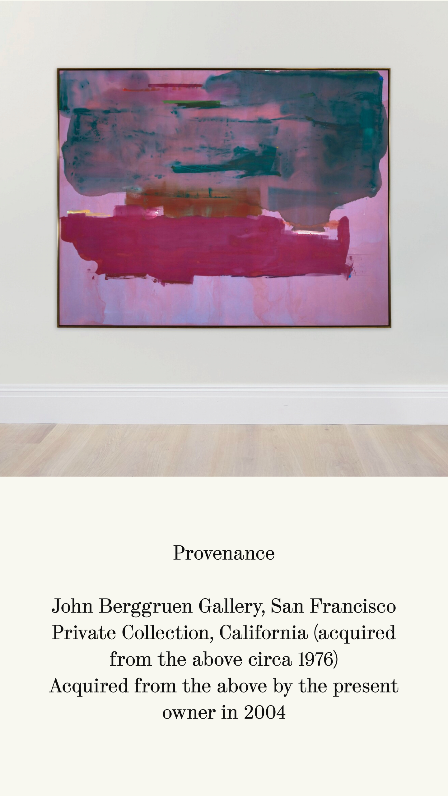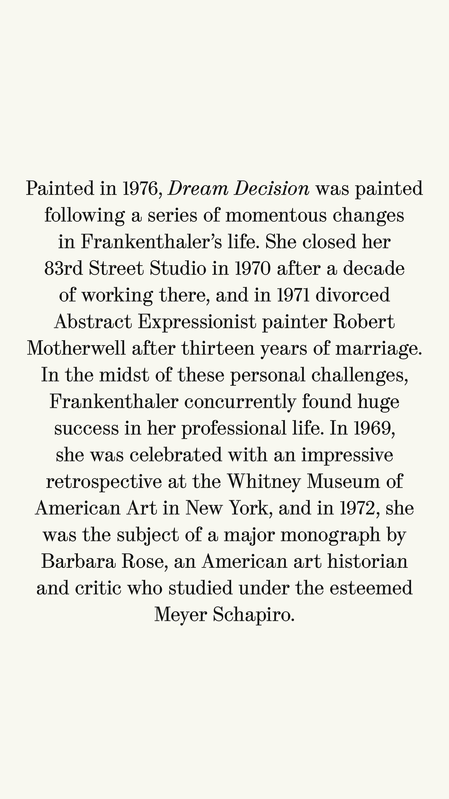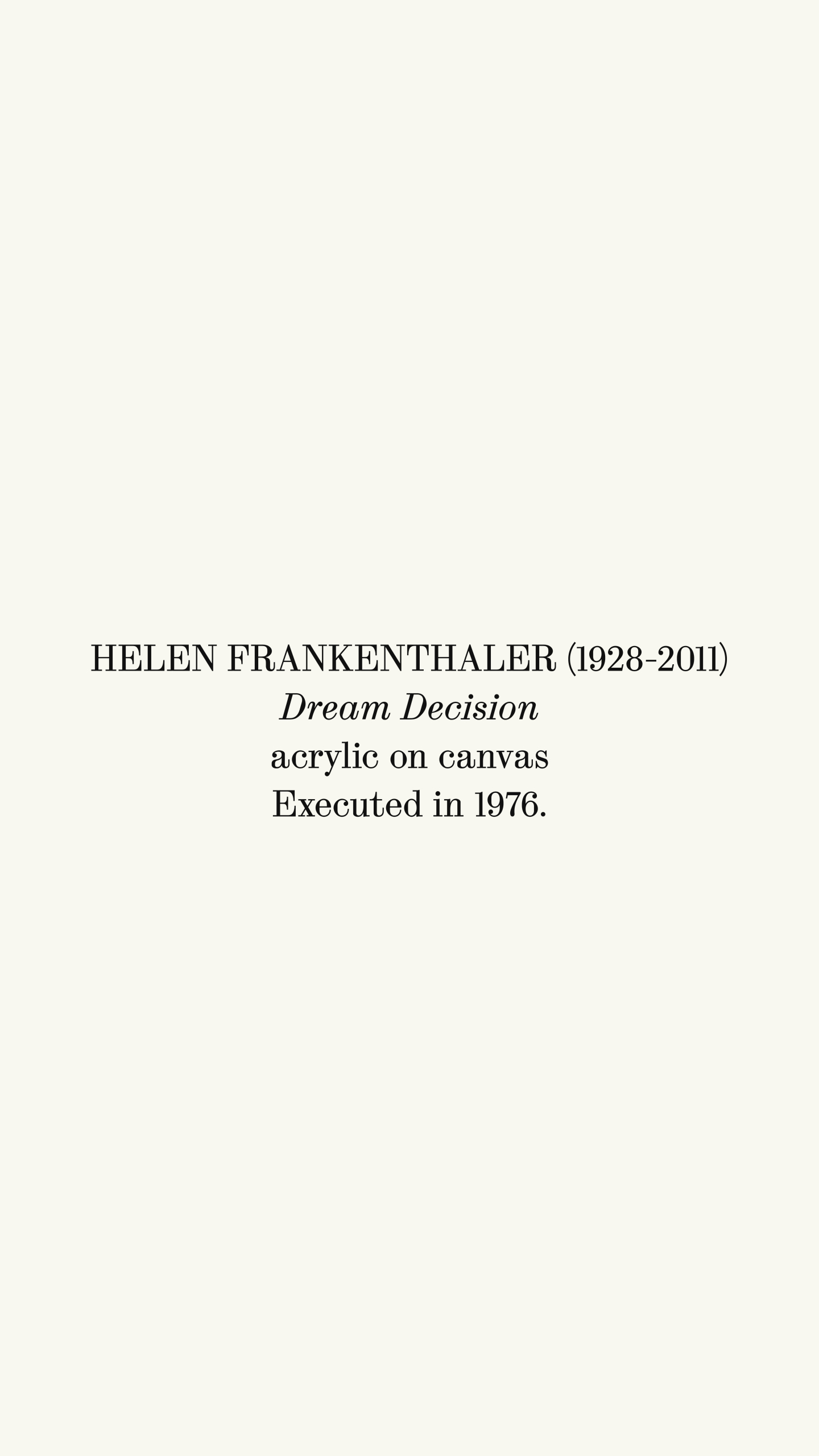 Painted in 1976, Dream Decision was painted following a series of momentous changes in Frankenthaler's life. She closed her 83rd Street Studio in 1970 after a decade of working there, and in 1971 divorced Abstract Expressionist painter Robert Motherwell after thirteen years of marriage.