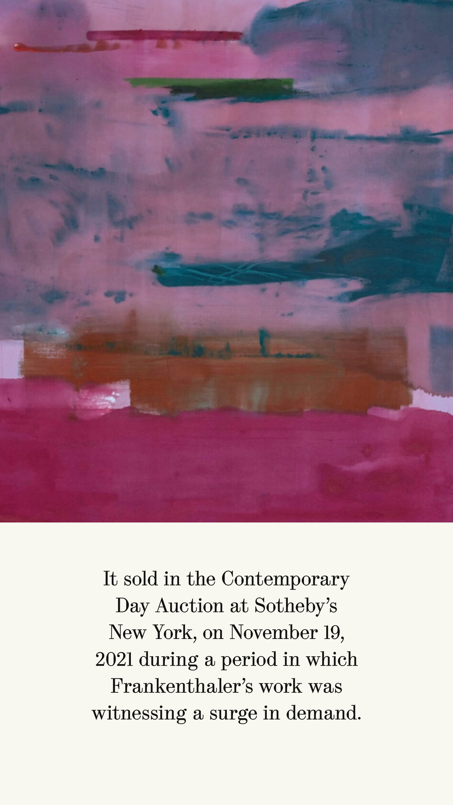 In the midst of these personal challenges, Frankenthaler concurrently found huge success in her professional life. In 1969, she was celebrated with an impressive retrospective at the Whitney Museum of American Art in New York, and in 1972, she was the subject of a major monograph by Barbara Rose, an American art historian and critic who studied under the esteemed Meyer Schapiro.