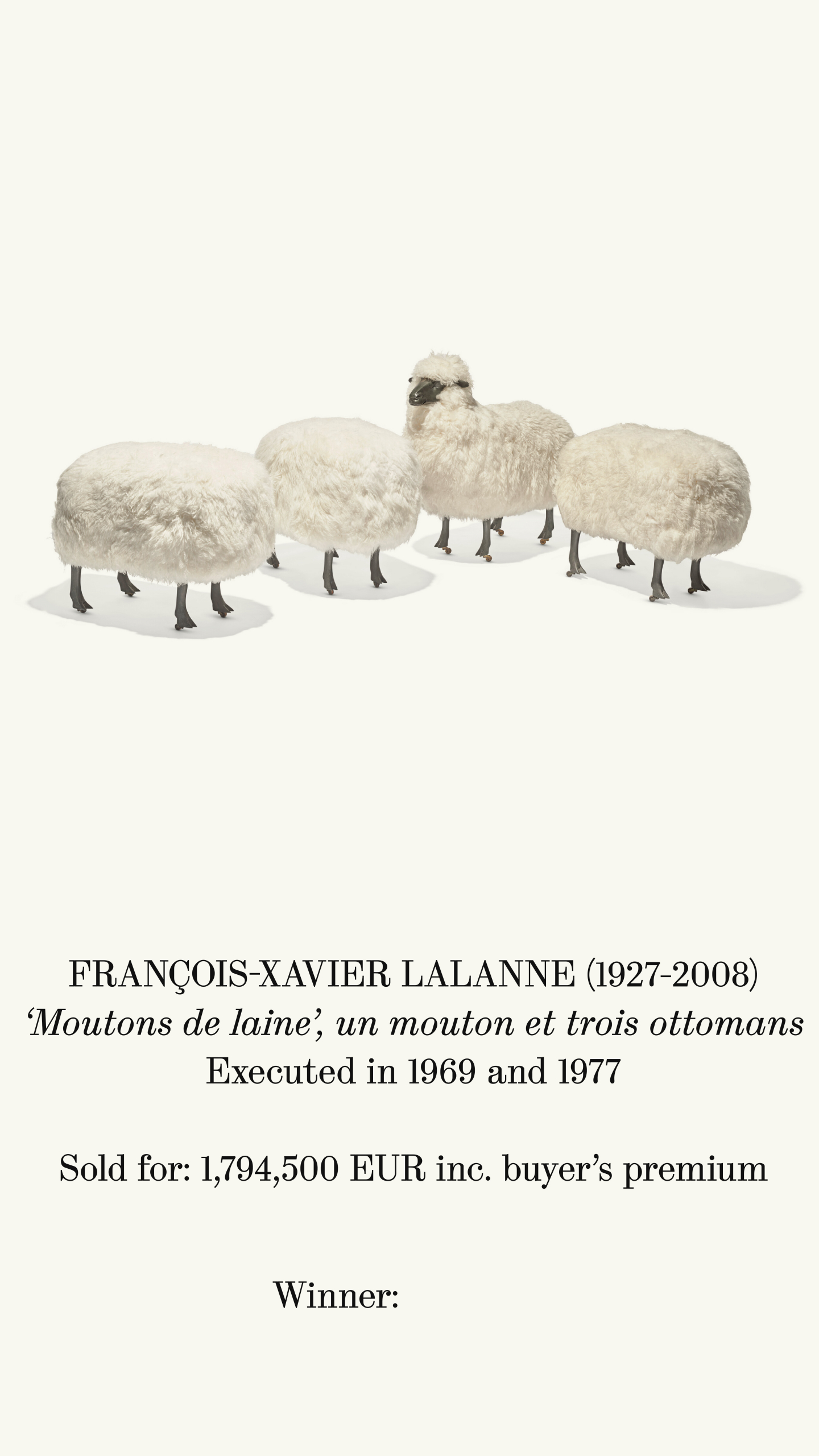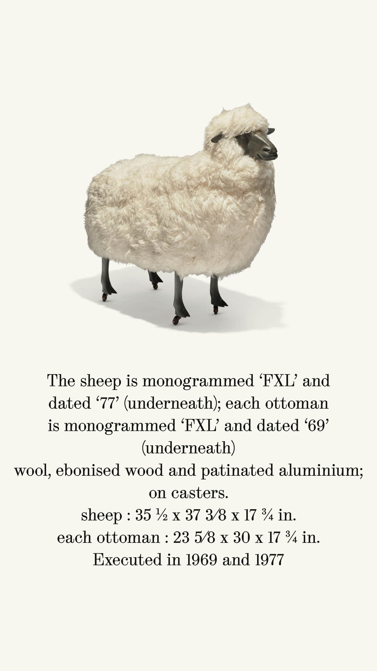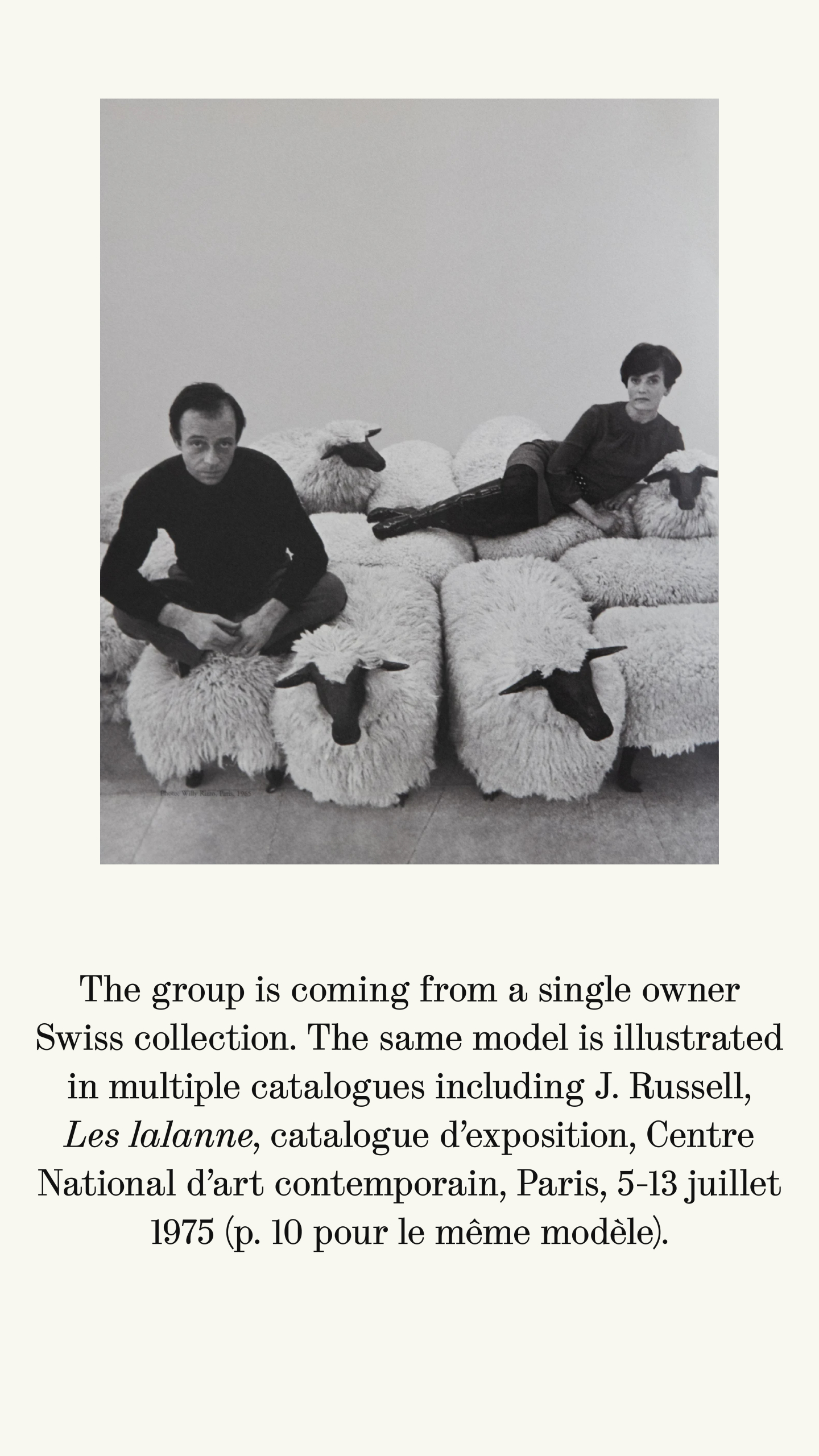 The group is coming from a single owner Swiss collection. The same model is illustrated in multiple catalogues including J. Russell, Les lalanne, catalogue d'exposition, Centre National d'art contemporain, Paris, 5-13 juillet 1975 (p. 10 pour le même modèle).