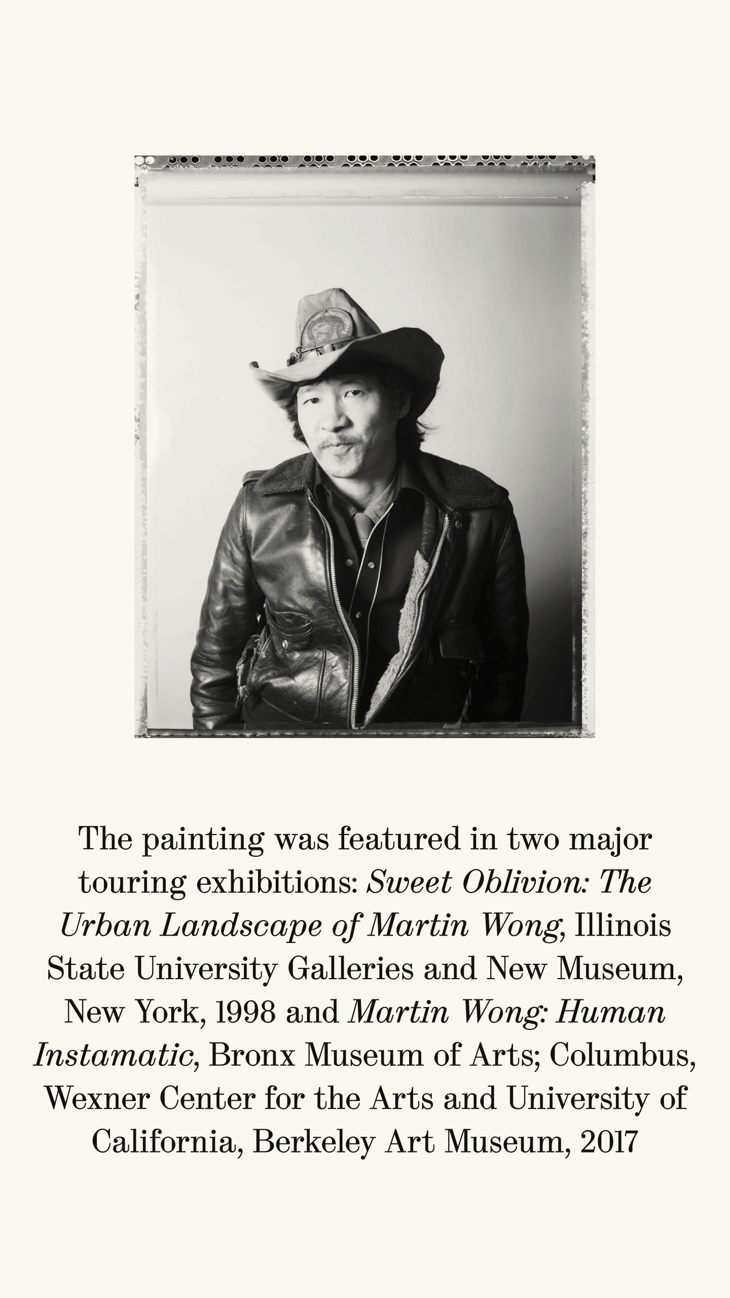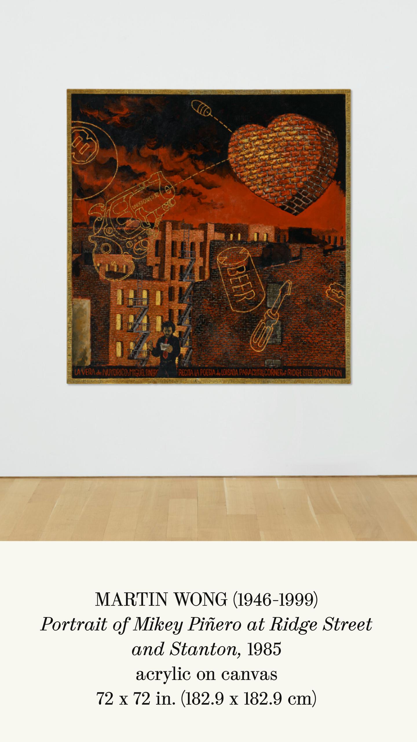 The painting was featured in two major touring exhibitions: Sweet Oblivion: The Urban Landscape of Martin Wong, Illinois State University Galleries and New Museum, New York, 1998 and Martin Wong: Human Instamatic, Bronx Museum of Arts; Columbus, Wexner Center for the Arts and University of California, Berkeley Art Museum, 2017.
