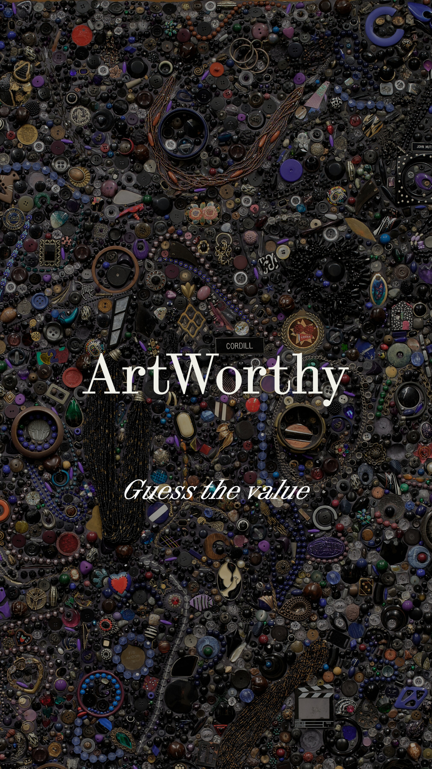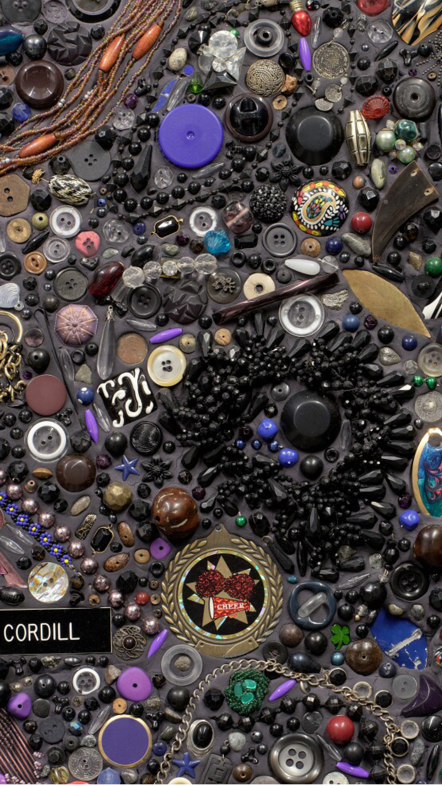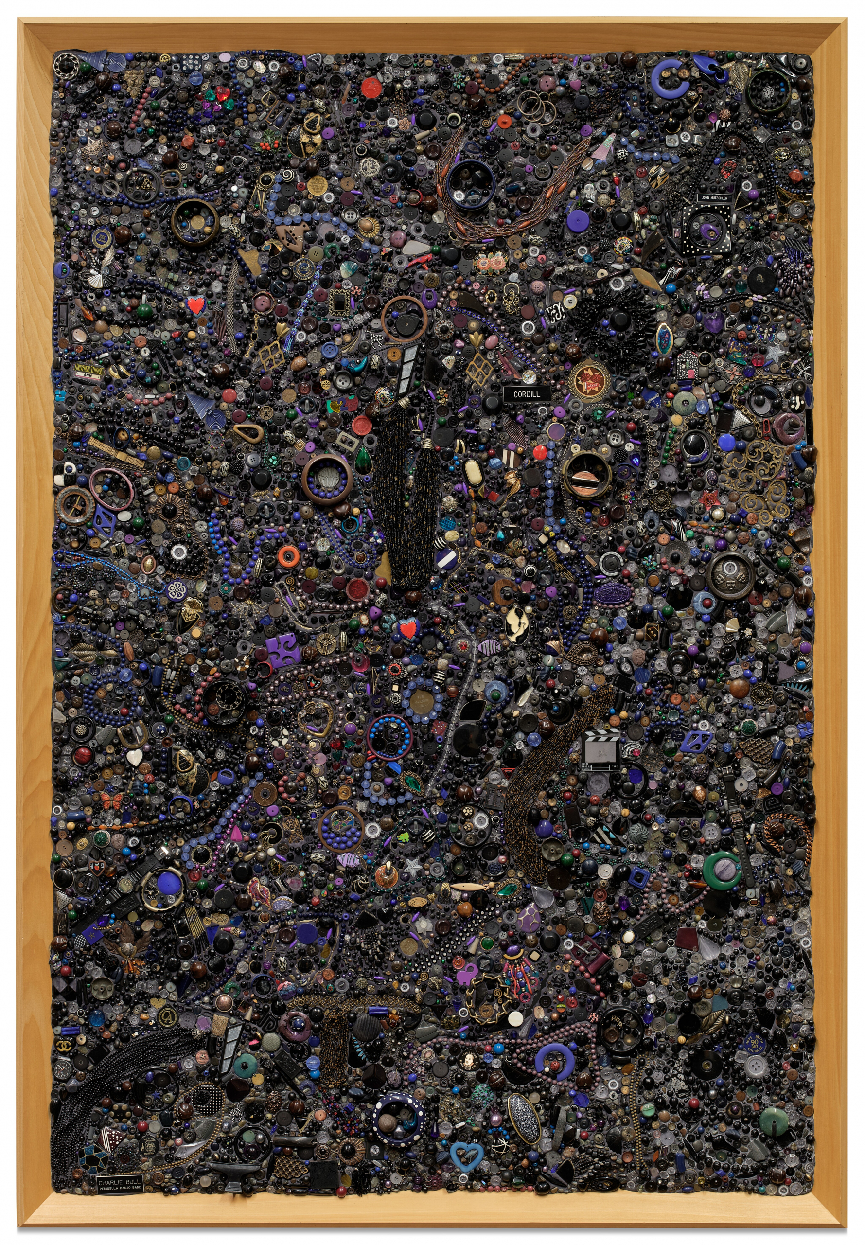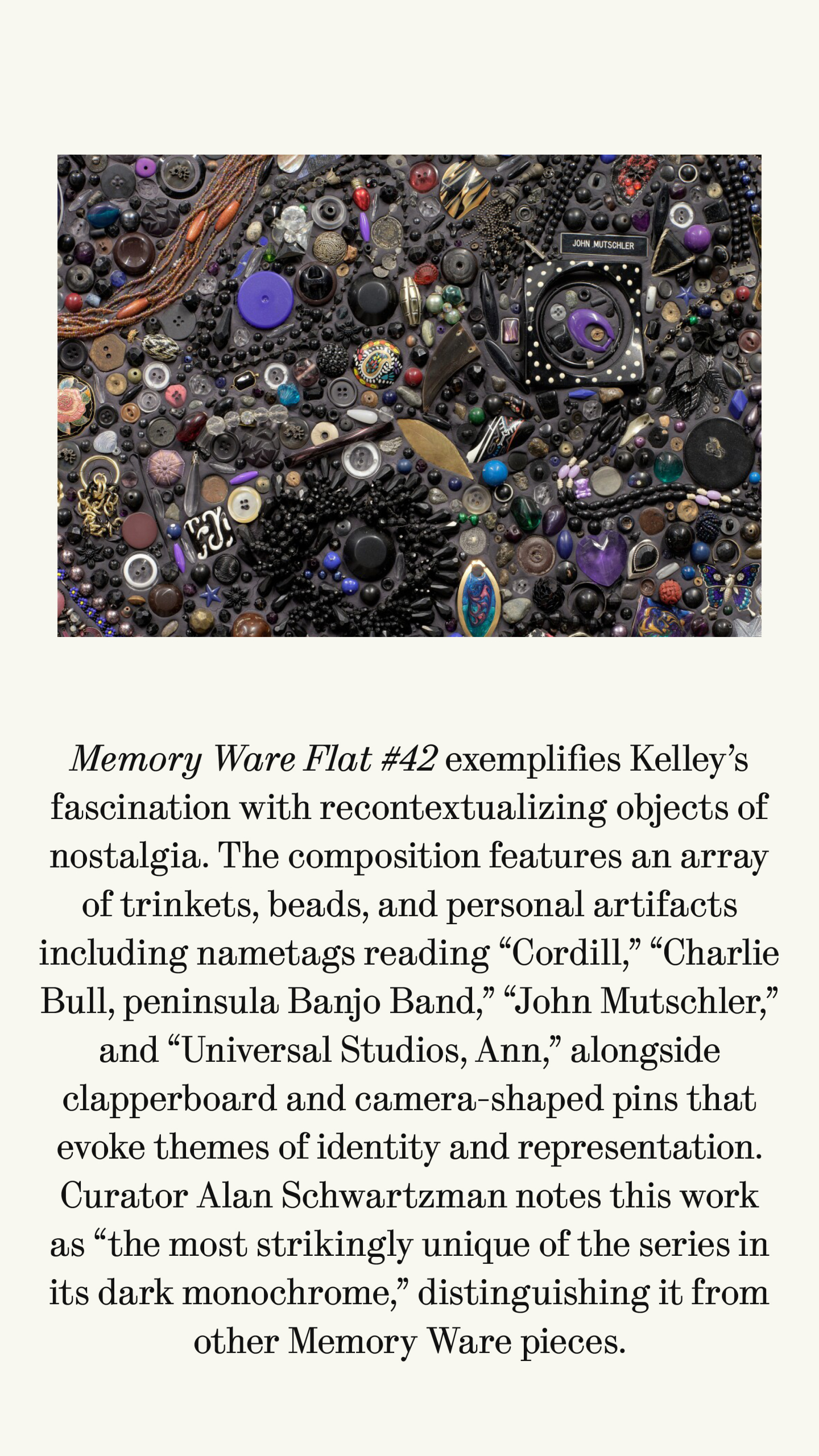 Memory Ware Flat #42 exemplifies Kelley's fascination with recontextualizing objects of nostalgia. The composition features an array of trinkets, beads, and personal artifacts including nametags reading "Cordill, "Charlie Bull, peninsula Banjo Band, "John Mutschler, and "Universal Studios, Ann," alongside clapperboard and camera-shaped pins that evoke themes of identity and representation. Curator Alan Schwartzman notes this work as "the most strikingly unique of the series in its dark monochrome," distinguishing it from other Memory Ware.