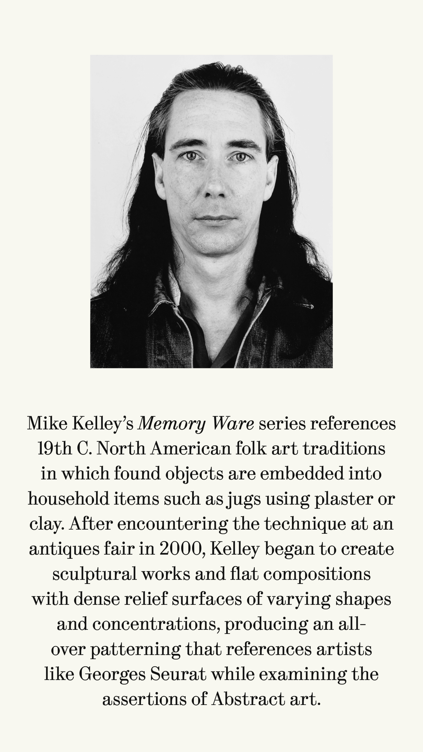 Mike Kelley's Memory Ware series references 19th C. North American folk art traditions in which found objects are embedded into household items such as jugs using plaster or clay. After encountering the technique at an antiques fair in 2000, Kelley began to create sculptural works and flat compositions with dense relief surfaces of varying shapes and concentrations, producing an all-over patterning that references artists like Georges Seurat while examining the assertions of Abstract art."