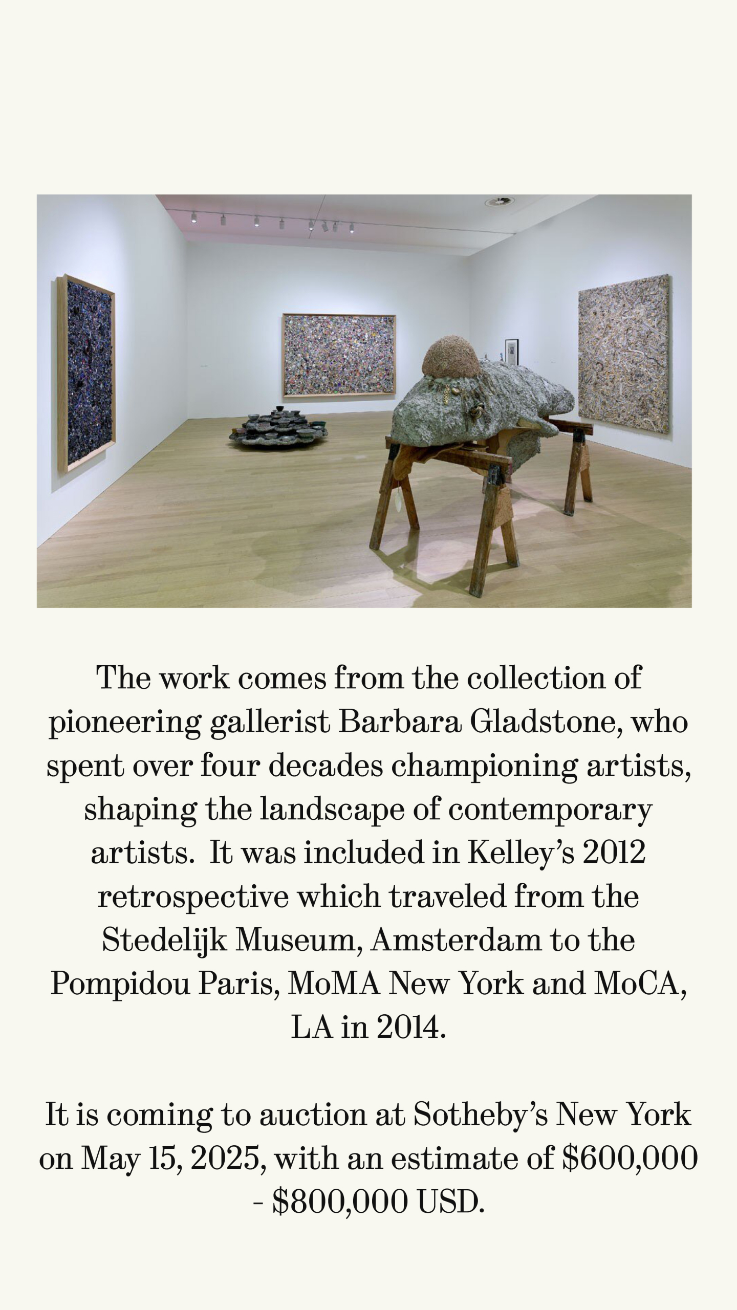 The work comes from the collection of pioneering gallerist Barbara Gladstone, who spent over four decades championing artists, shaping the landscape of contemporary artists. It was included in Kelley's 2012 retrospective which traveled from the Stedelijk Museum, Amsterdam to the Pompidou Paris, MoMA New York and MoCA, LA in 2014.