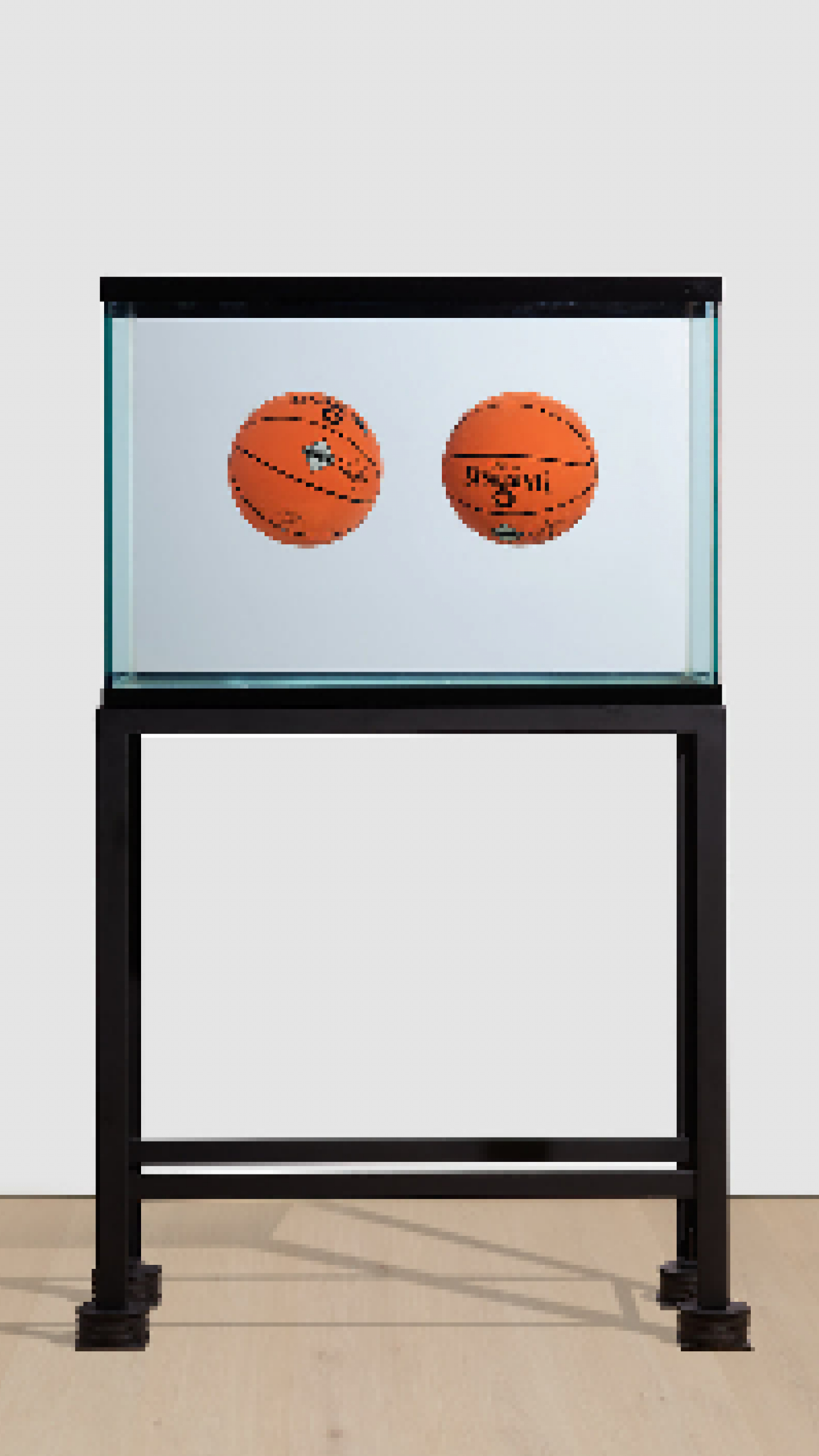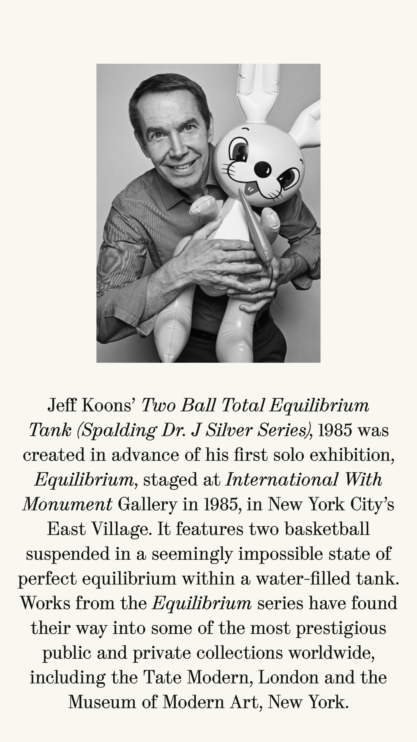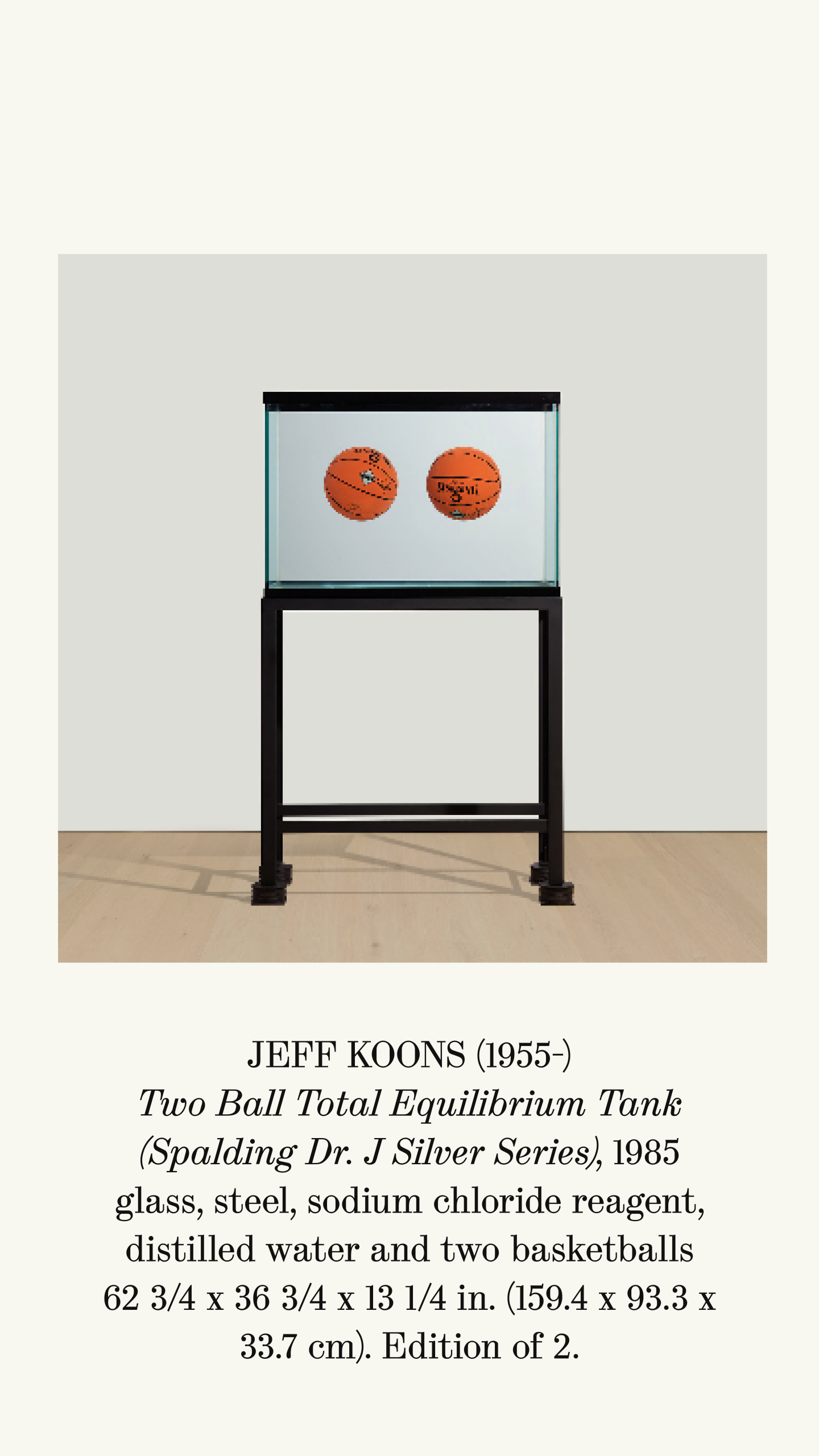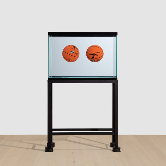 Jeff Koons’ Two Ball Total Equilibrium Tank (Spalding Dr. J Silver Series), 1985 was created in advance of his first solo exhibition, Equilibrium, staged at International With Monument Gallery in 1985, in New York City’s East Village. It features two basketball suspended in a seemingly impossible state of perfect equilibrium within a water-filled tank. Works from the Equilibrium series have found their way into some of the most prestigious public and private collections worldwide, including the Tate Modern, London and the Museum of Modern Art, New York.