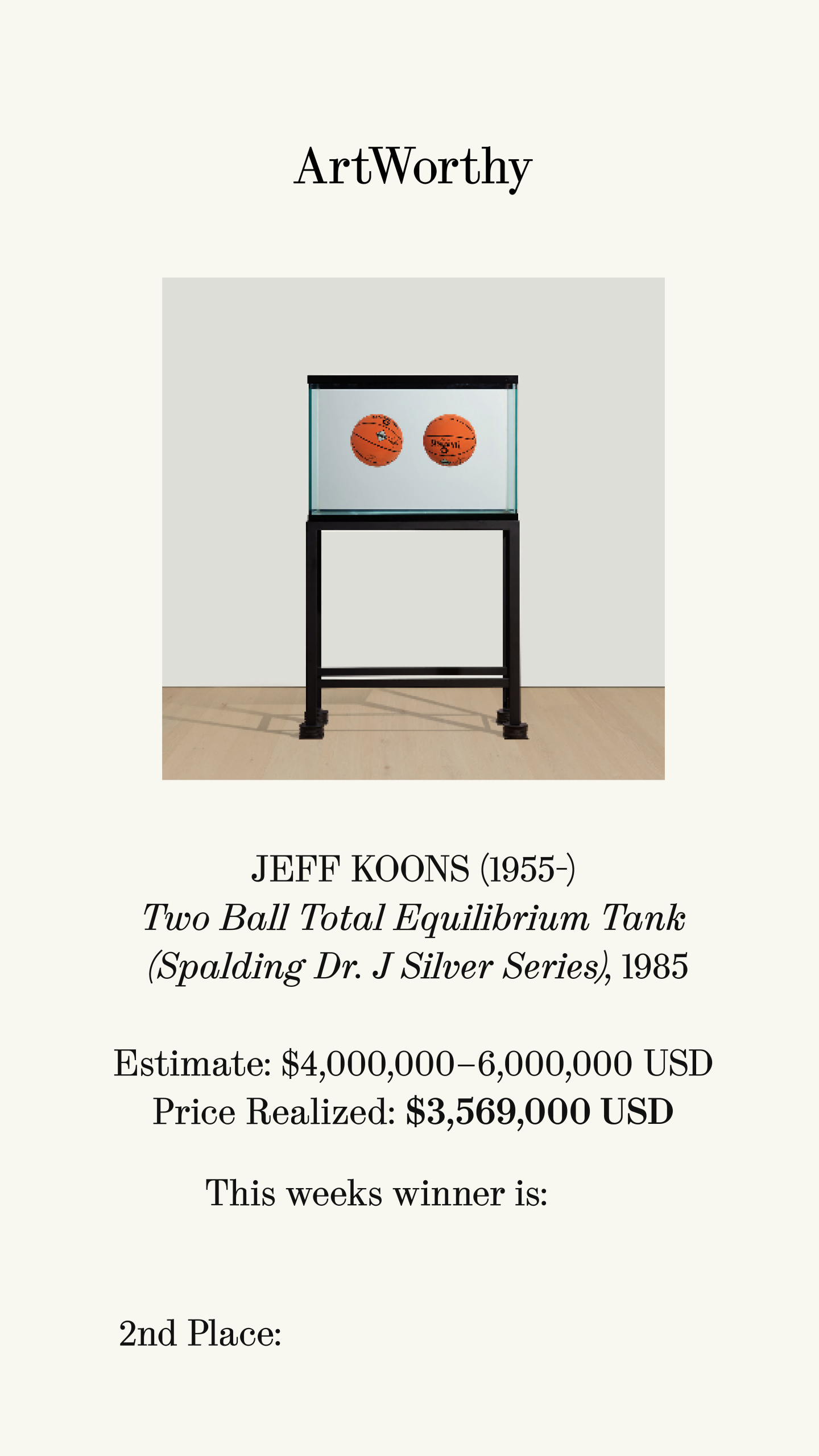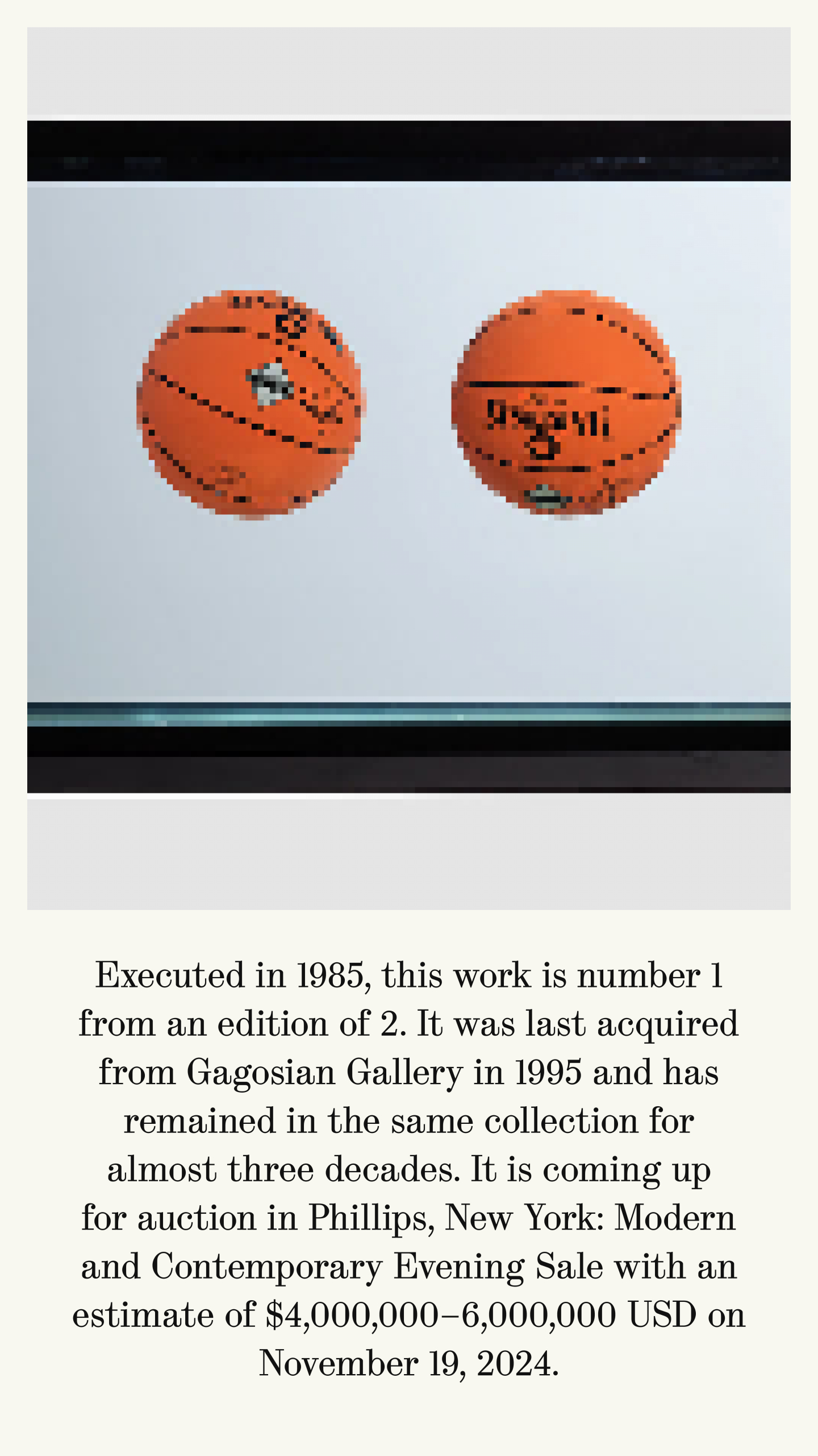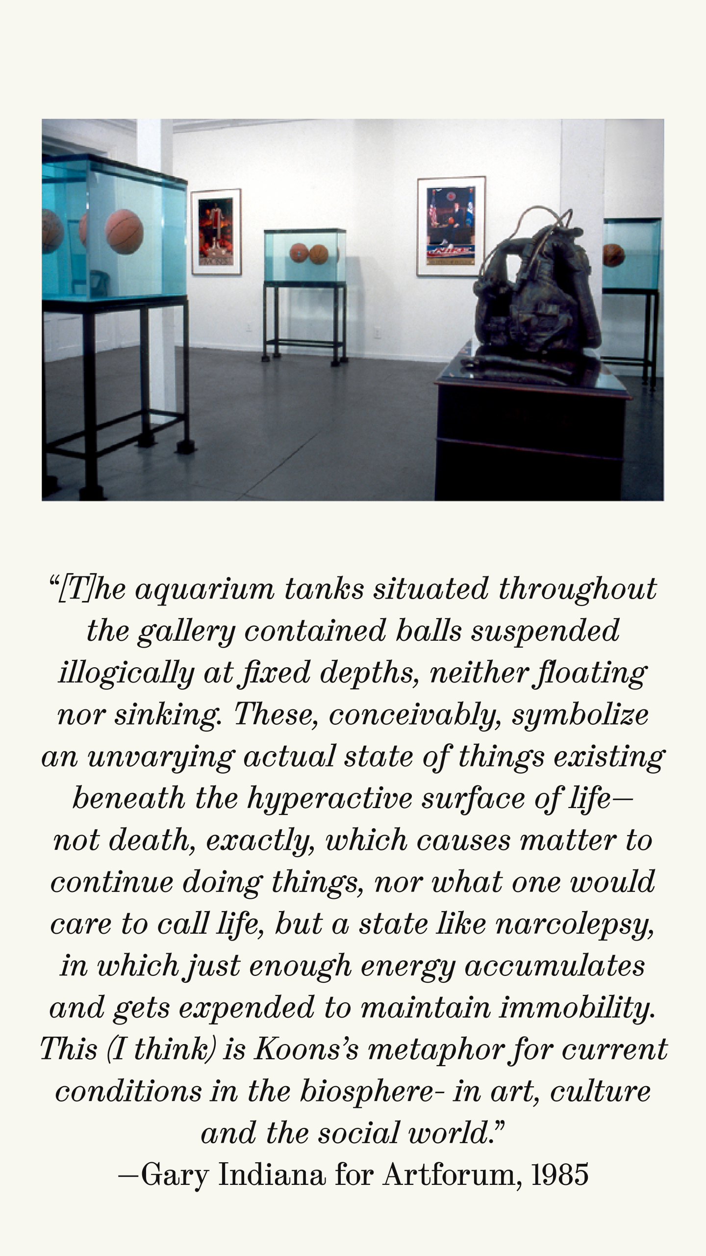 Jeff Koons’ Two Ball Total Equilibrium Tank (Spalding Dr. J Silver Series), 1985 was created in advance of his first solo exhibition, Equilibrium, staged at International With Monument Gallery in 1985, in New York City’s East Village. It features two basketball suspended in a seemingly impossible state of perfect equilibrium within a water-filled tank. Works from the Equilibrium series have found their way into some of the most prestigious public and private collections worldwide, including the Tate Modern, London and the Museum of Modern Art, New York.