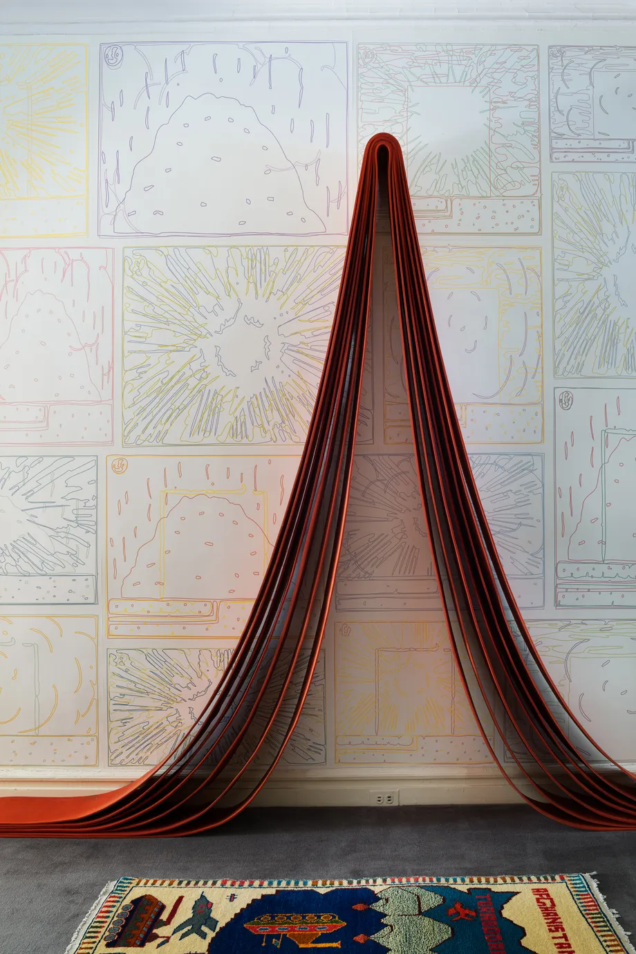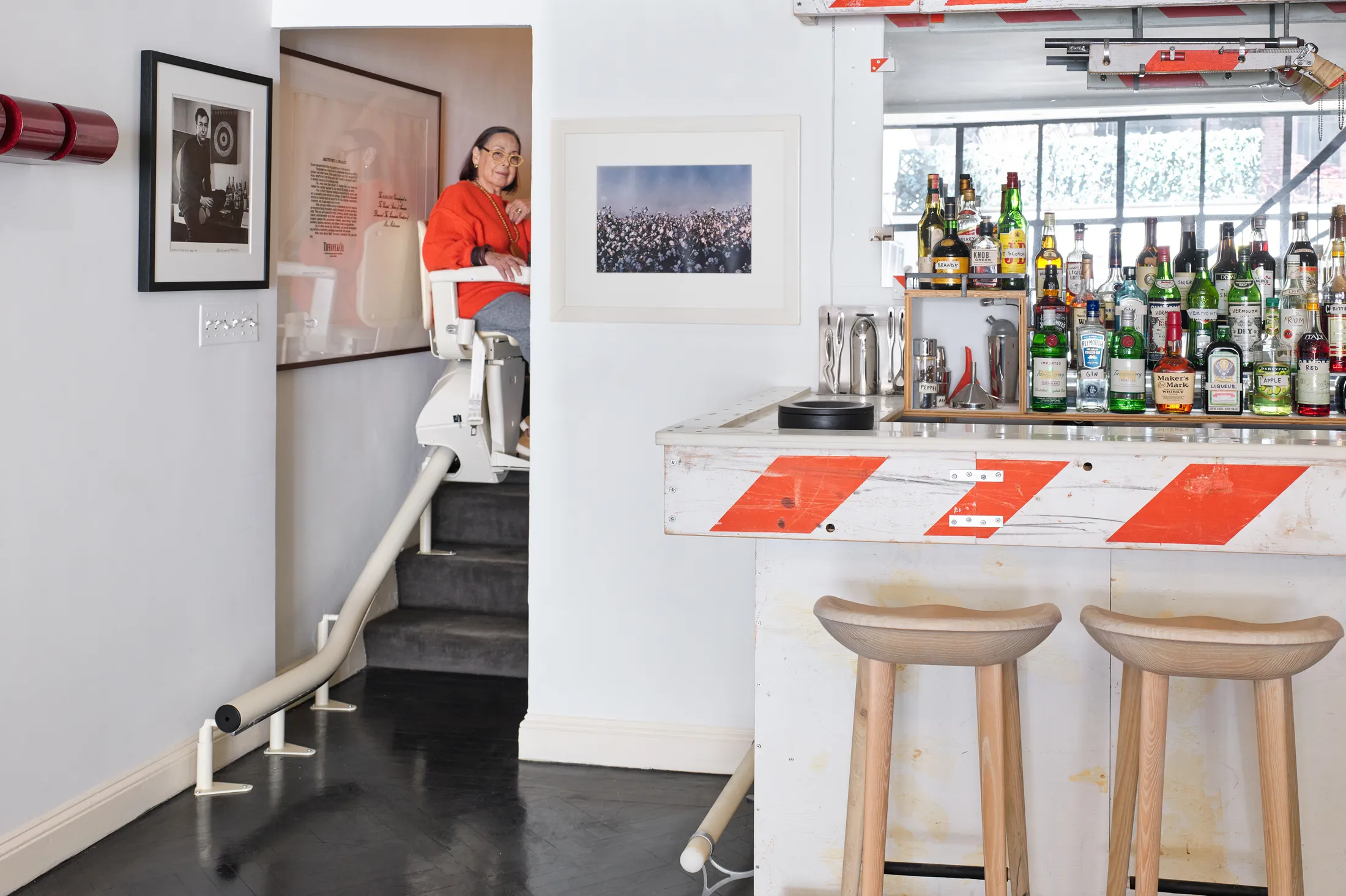 Following the sale, Jakobson continued to collect with a focus on furniture designed by artists. She already owned a daybed by the sculptor Rachel Whiteread and a “Lolita” rug by Barbara Bloom. Having sold her dining room furniture, Jakobson commissioned Tom Sachs to design a bar, which he constructed out of orange-and-white-striped beams from Con Edison barricades. Sachs also asked Jakobson to maintain his selection of beverages—the artist had placed handwritten labels like “red” for Campari over each bottle. A shotgun, also made from a Con Edison barricade, hangs over the bar.