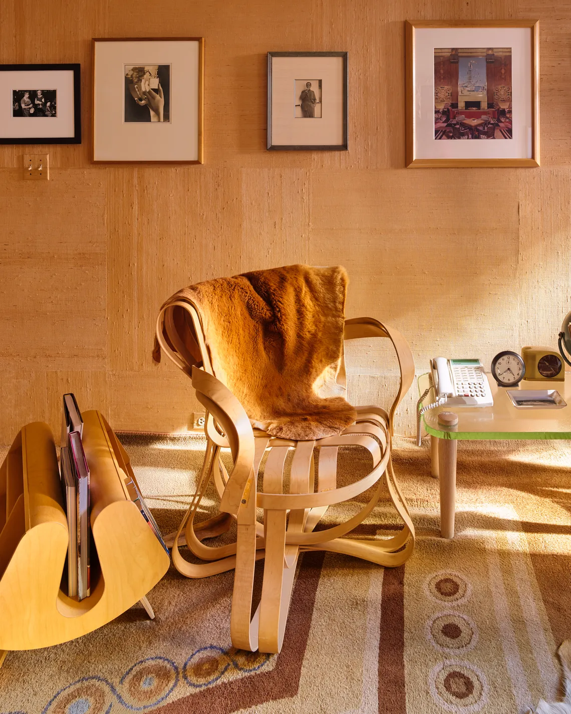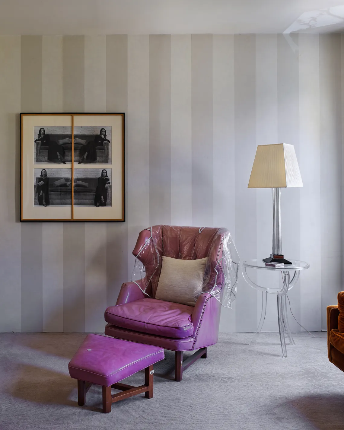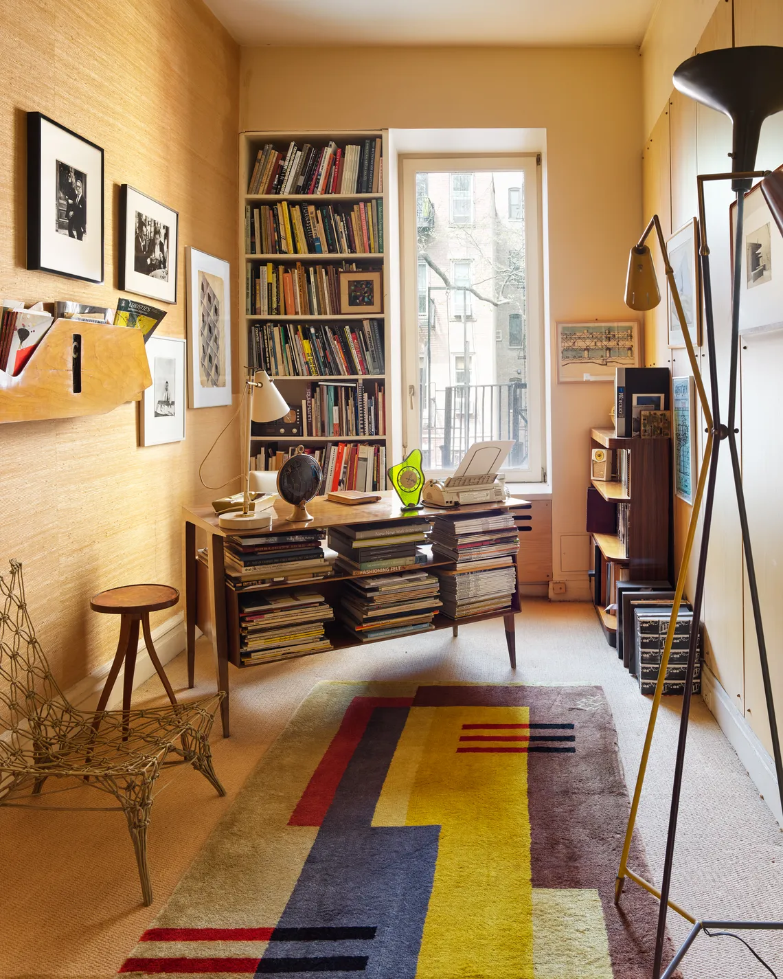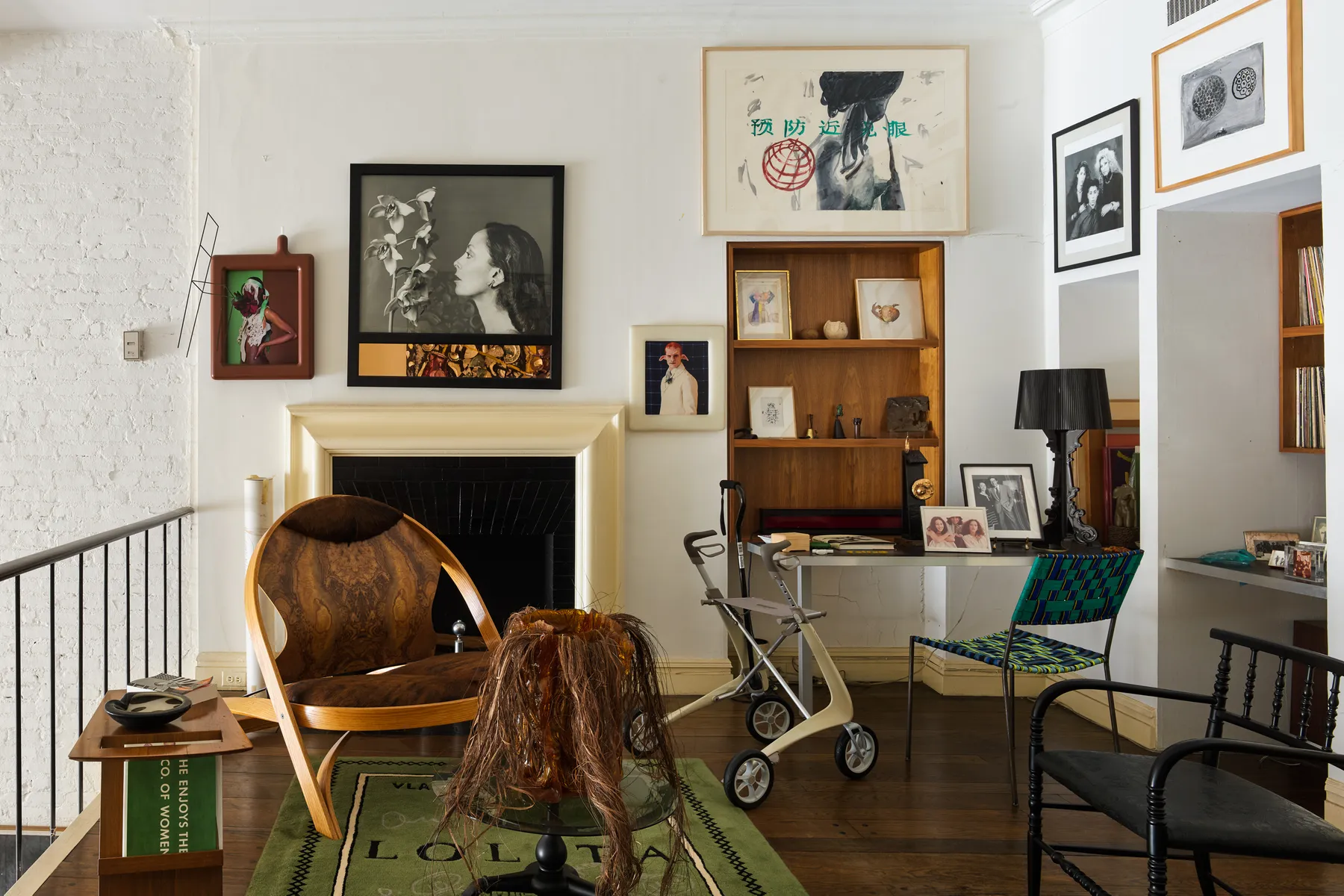 Image: A portrait of Jakobson by her late friend Robert Mapplethorpe hangs above the fireplace in the sitting room. Other pieces include photographs by Matthew Barney. The chair in front of the fireplace is designed by Richard Artschwager and the “Lolita” rug is by Barbara Bloom. A rubber vase by the Campana brothers occupies the middle of the room.