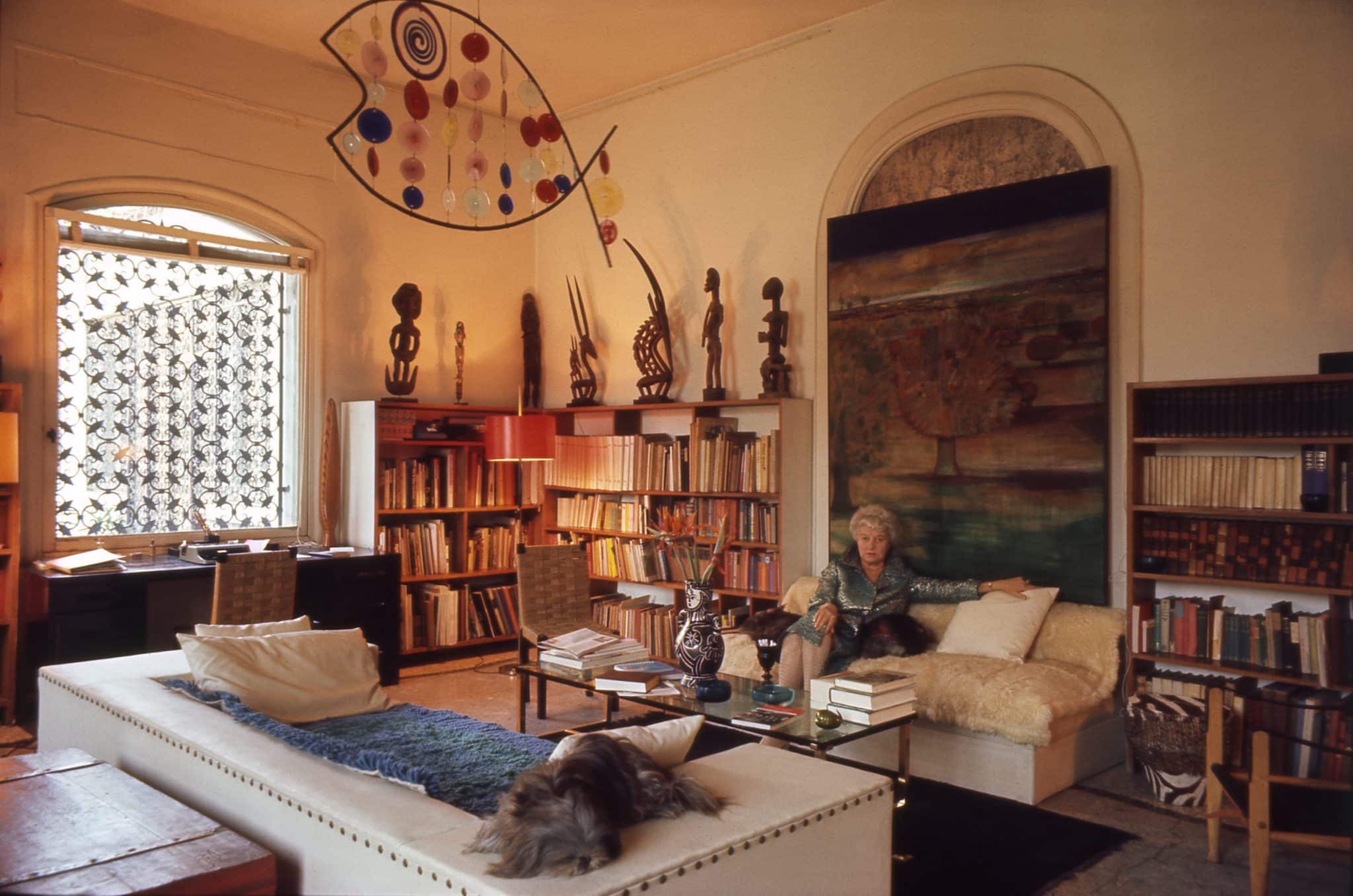 Image: Guggenheim in the palazzo’s dining room, standing beside the Umberto Boccioni sculpture “Dynamism of a Speeding Horse + Houses,” 1914–15. On the chests to either side of her are an Ago Egungun headdress (left), made in the first half of the 20th century by a Yoruba artist in what is today Nigeria.